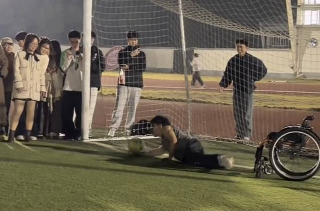 起初,同学们都“脚下留情”,将球轻轻踢向他。良田见状,冲场上喊道:“别把他当人,往死里踢!”这句看似粗粝的玩笑,卸下了大家心里的“负担”,开始认真射门。“当大家都把我当正常人对待的时候,我才真的感觉好玩。”马尚在也彻底投入,一次次用双臂的力量将自己从轮椅上“抛”出去扑救,又一次次侧翻在地。他爬起来,自己翻上轮椅,目光紧紧追着下一颗球。不知失败了多少次后,他终于判断对了方向,奋力一扑,将球挡在了球门外。瞬间,全场沸腾,所有人欢呼着冲向他,将他连人带轮椅一起高高举起。